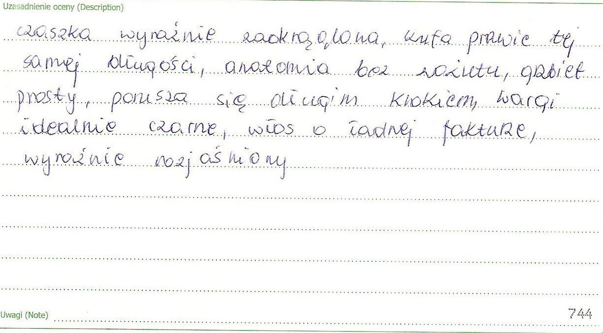 posuzovatel: Waldemar Mrowiec, PL, posudek: středně velká fena, správných proporcí, dobrá typická hlava, korektní skus, příliš krátké rameno, dobrý krk, dobrá hřbetní linie, dobré zaúhlení zadních končetin.