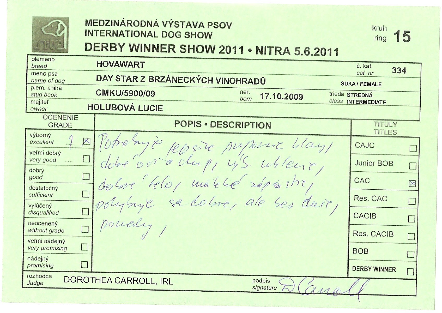 posuzovatel: G. Ridarčíková, SK, posudek: fena dobré velikosti, pěkná hlava, správné konstituce, korektní horní linie, hrudník dobré hloubky i šířky, výborně zaúhlená, dobrý pohyb.